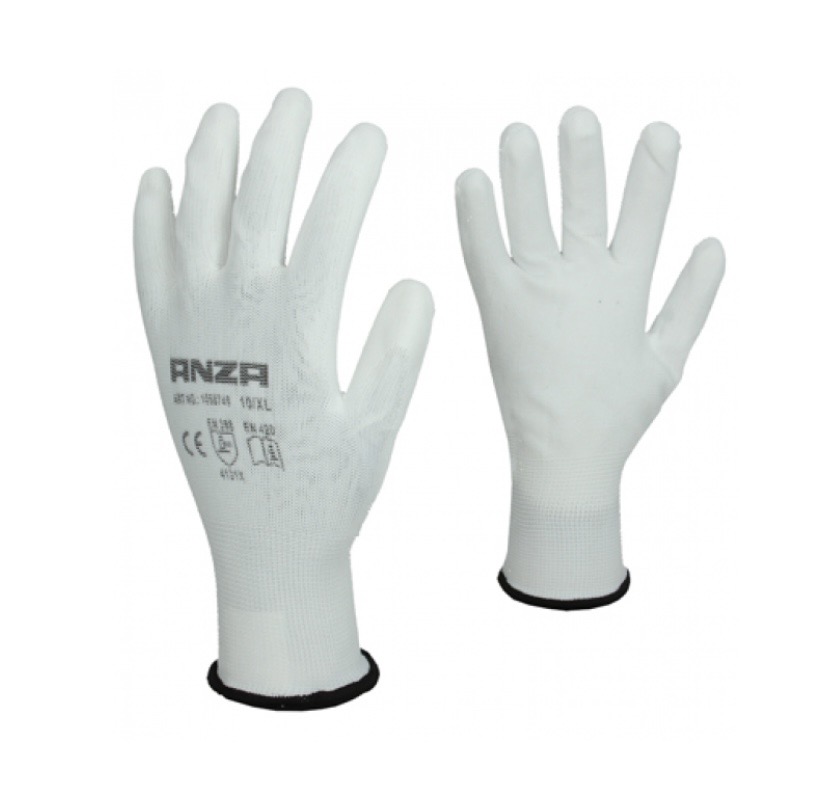 Anza schildershandschoenen zijn gemaakt van een combinatie van ademend nylon en een witte polyurethaan (PU) coating.