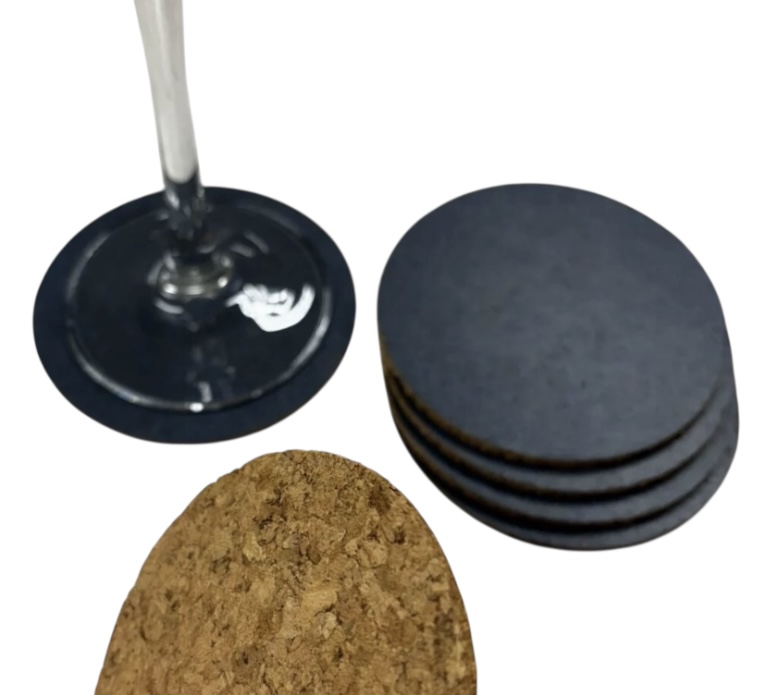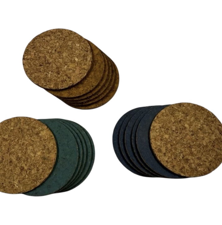 Onderzetters van perskurk die aan een zijde voorzien zijn van een verflaagje in de kleur blauw.