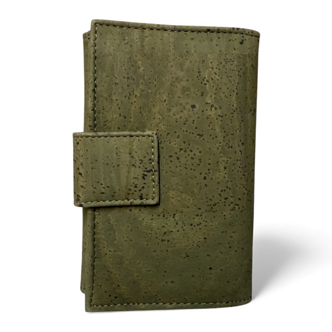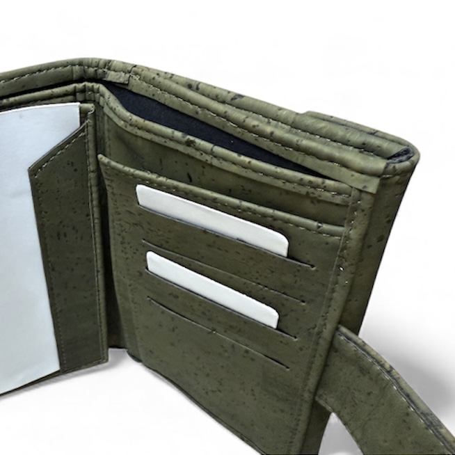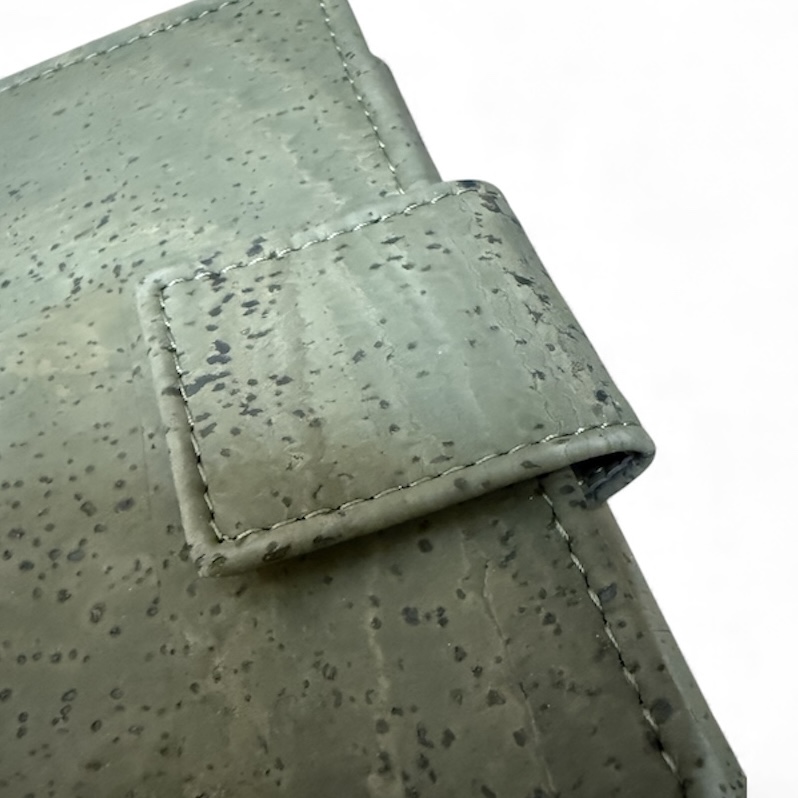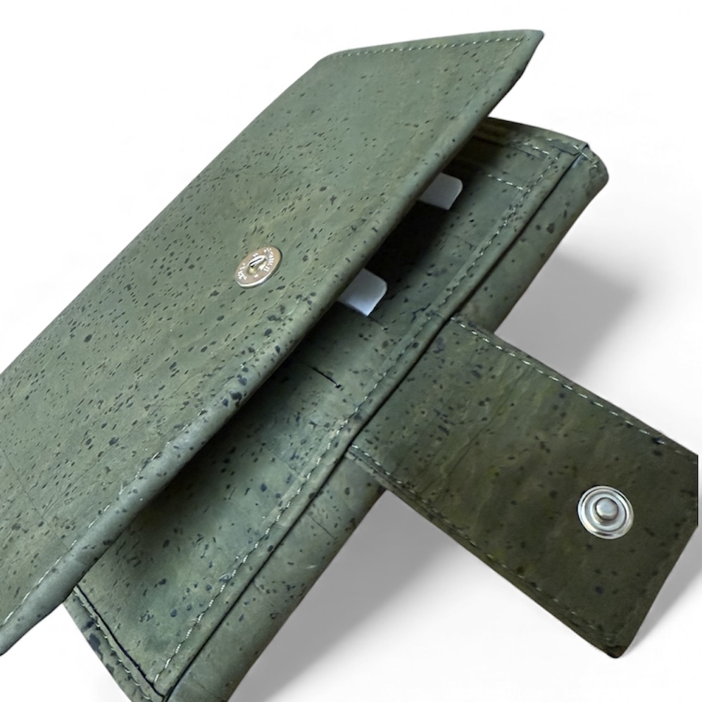 Veganistische portemonnee met vakken en een drukknoop sluiting.