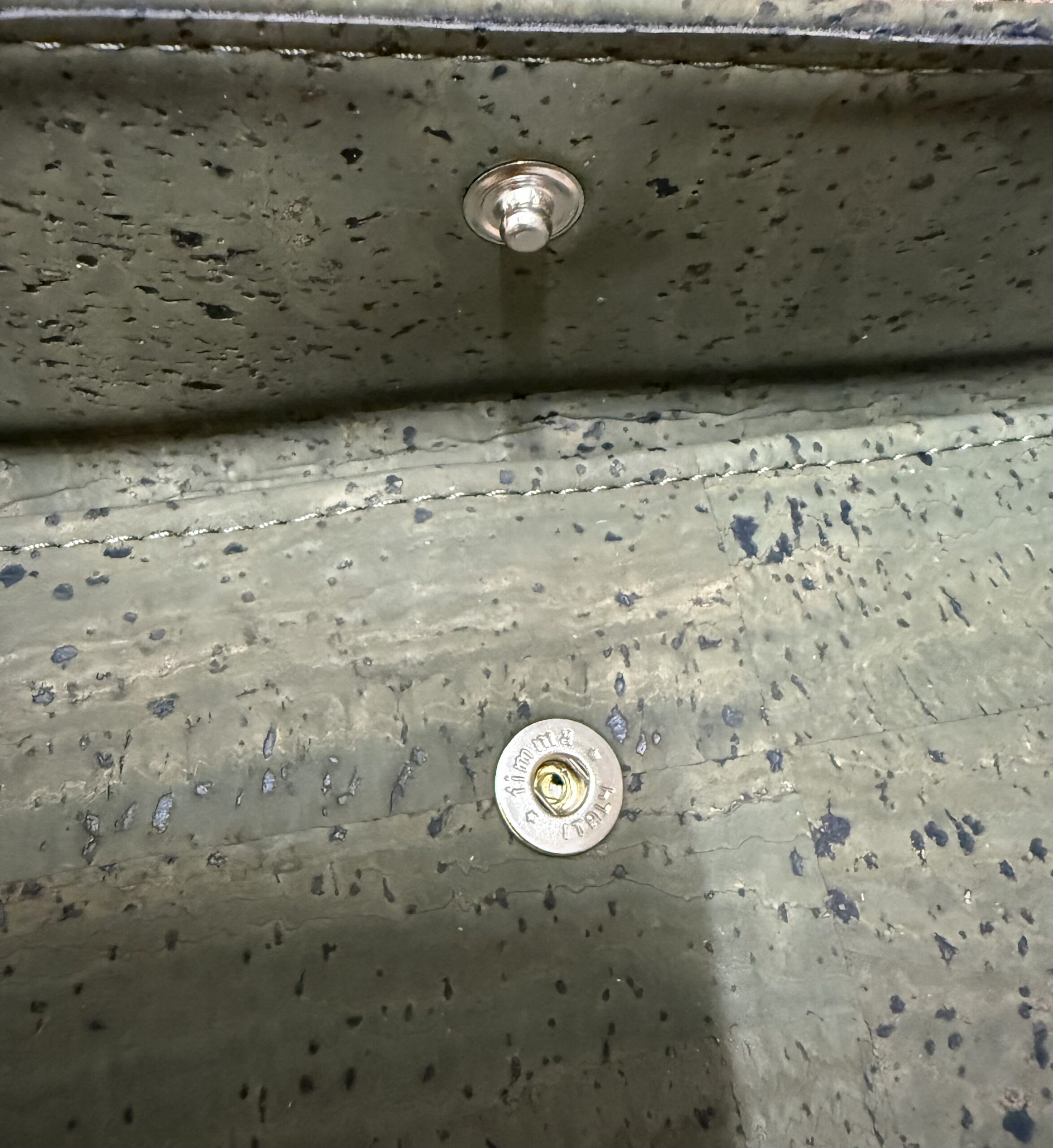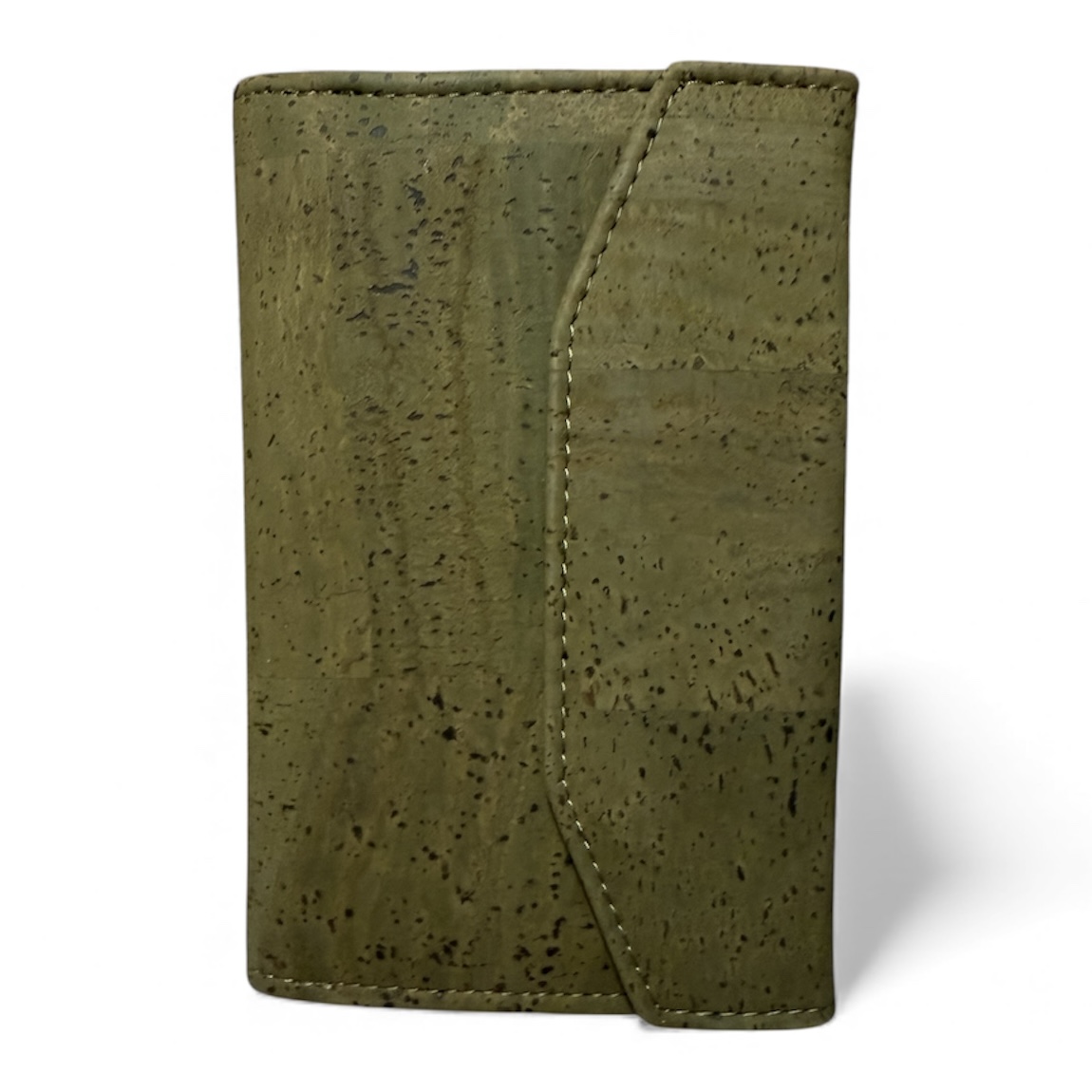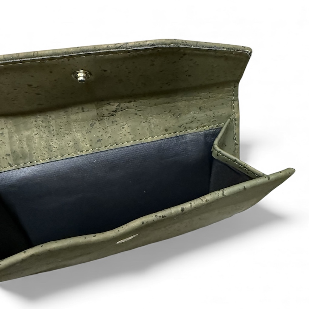 Veganistische portemonnee met vakken en een drukknoop sluiting.