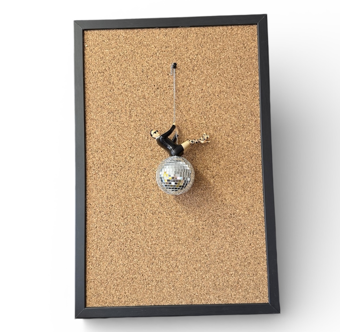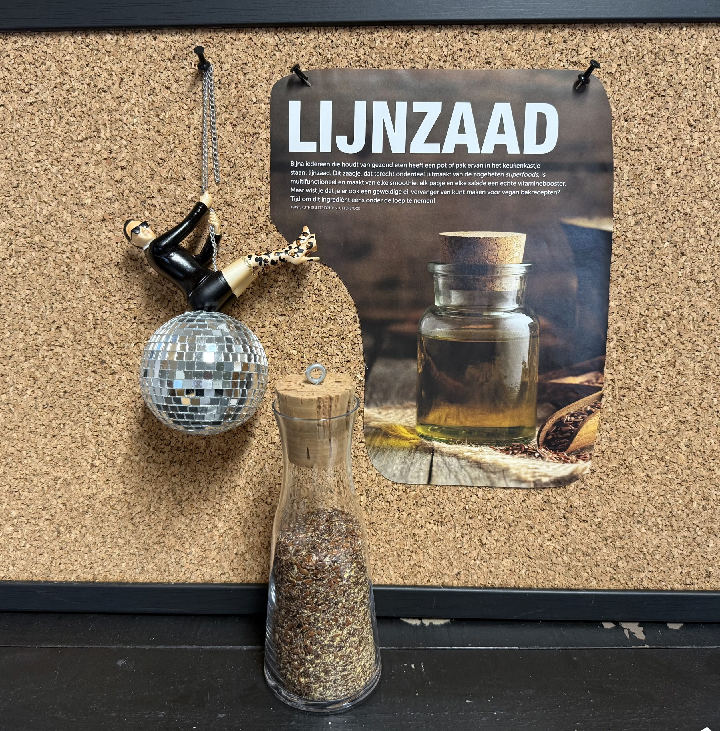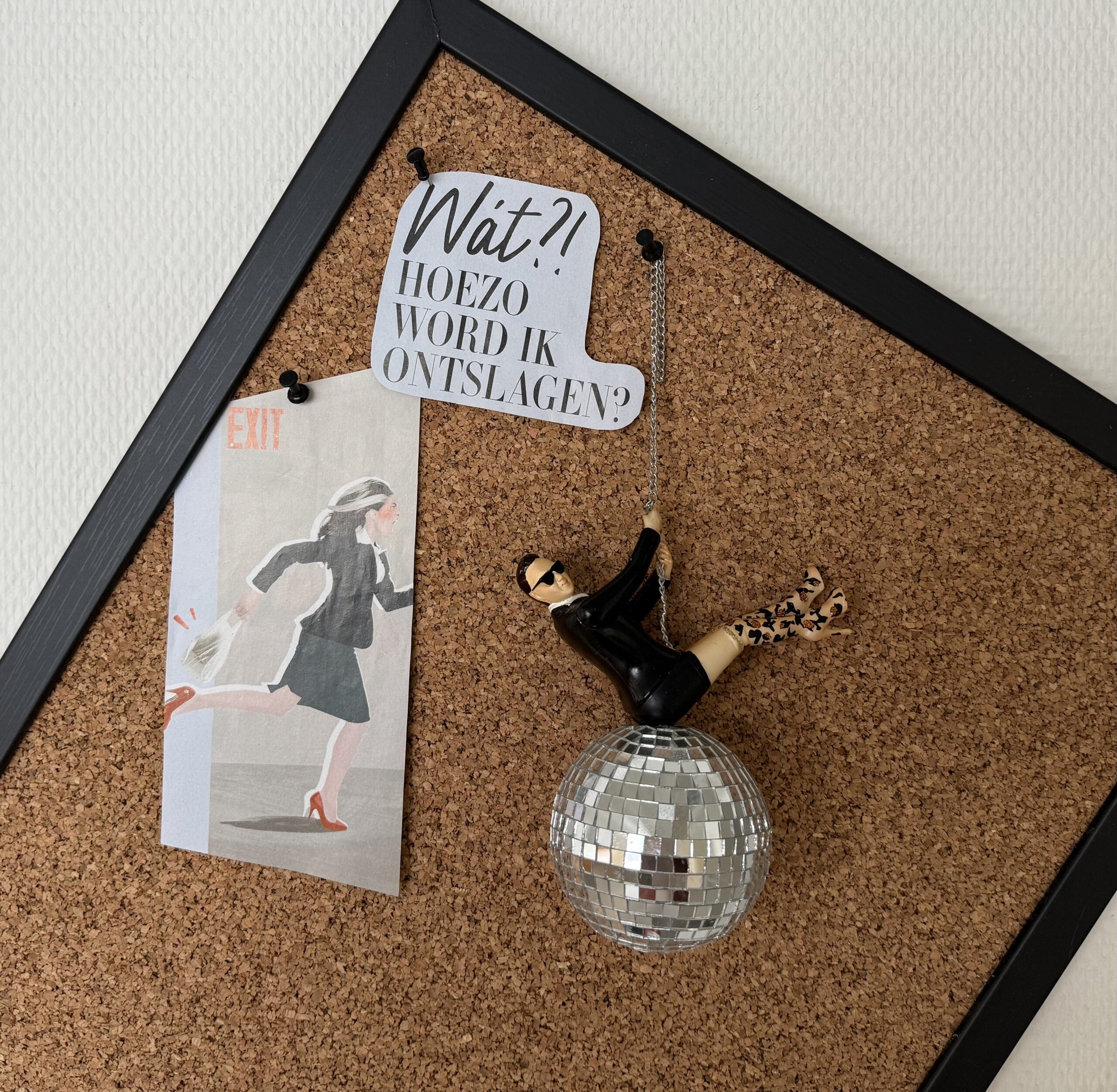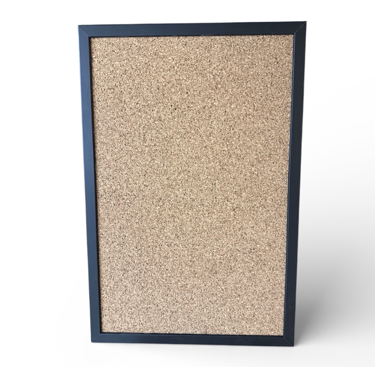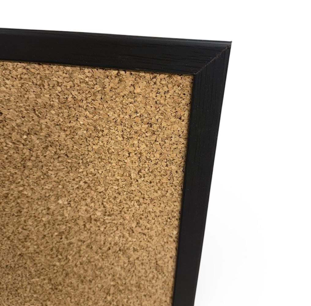 Het prikbord is van perskurk gemaakt met een zwarte houten lijst en is heel trendy.